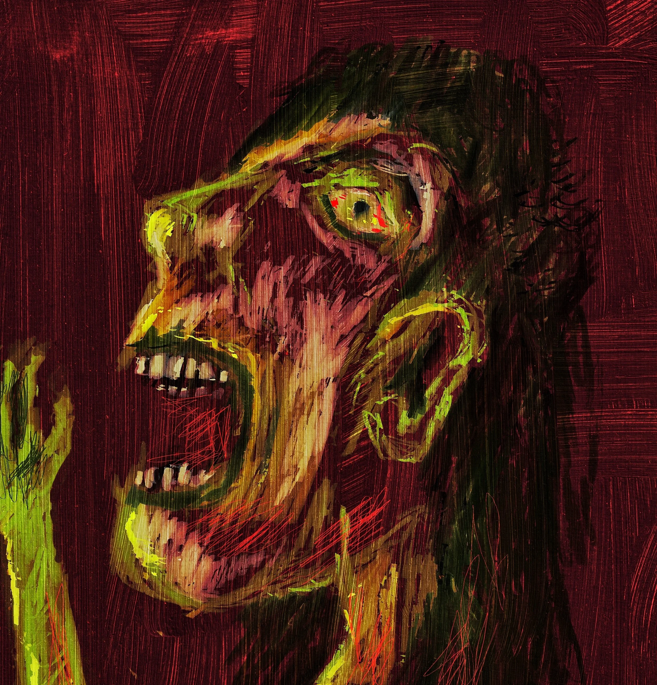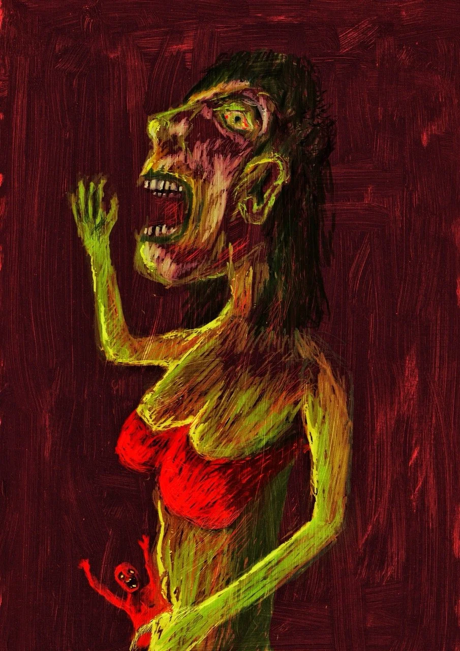 The green came first. Thick, glowing, almost wet-looking green. Not a clean or comforting green, but something damp and fungal, like moss, rot, stagnant water, and earth all mixed together. It has that woodland smell to it — mud, decay, growth happening all at once. The digital paint feels heavy, goopy, dragged around rather than carefully placed. That was deliberate. I wanted it to feel physical, like substance rather than image.